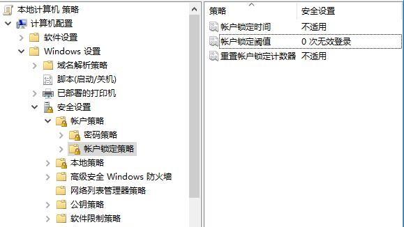定位至计算机配置 - Windows设置 - 安全设置 - 账户策略 - 帐户锁定策略,然后在右侧窗口就可以看到帐户锁定阈值设置选项。 如图:默认的是0次无效登录,我们来看看该选项的设置说明,看看是什么意思。